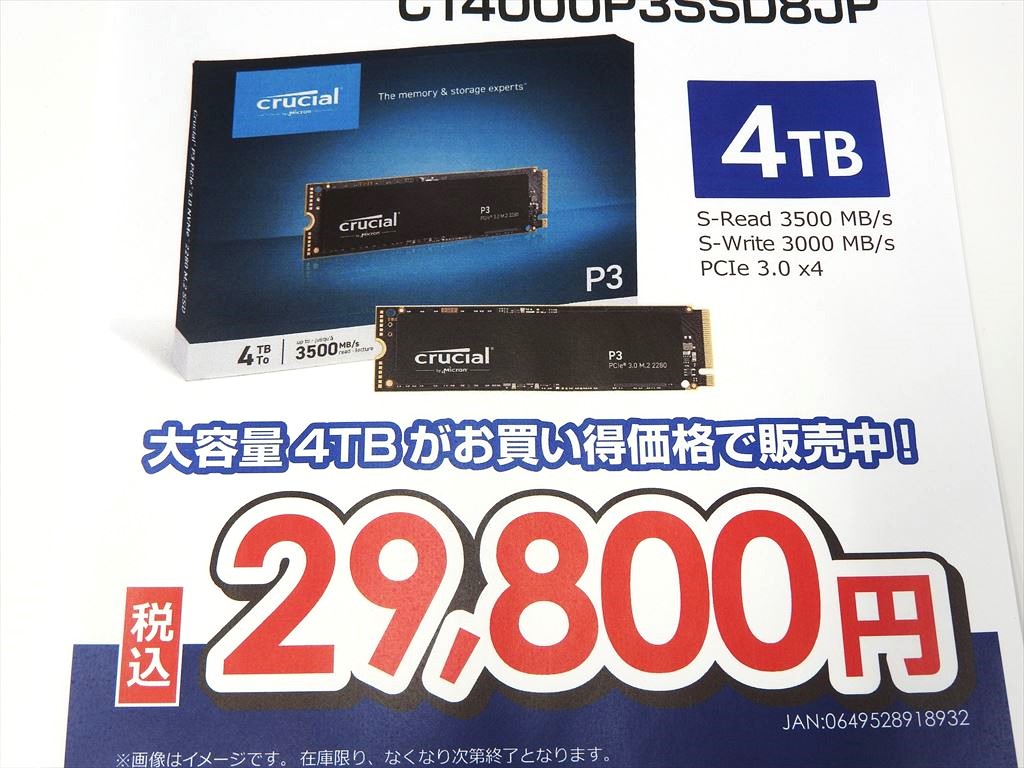 (アキバ入荷情報) 4TB最安クラスのCrucial製NVMe M.2 SSDが大特価で販売中