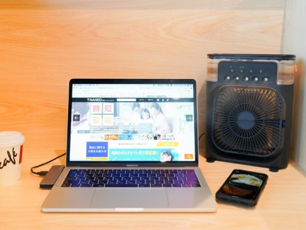 水が液体に変わる際に奪う気化熱の仕組みを利用した、卓上サイズの冷風扇