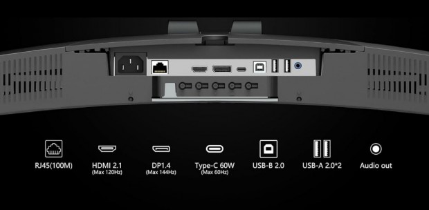 液晶パネルはVA方式、色域はsRGBカバー率99%、DCI-P3カバー率95%、コントラスト比3,000:1。インターフェイスはHDMI 2.1×1、DisplayPort 1.4×1、USB Type-C×1、USB Type-B×1、USB Type-A×2、有線LAN×1、オーディオ出力×1を搭載する。