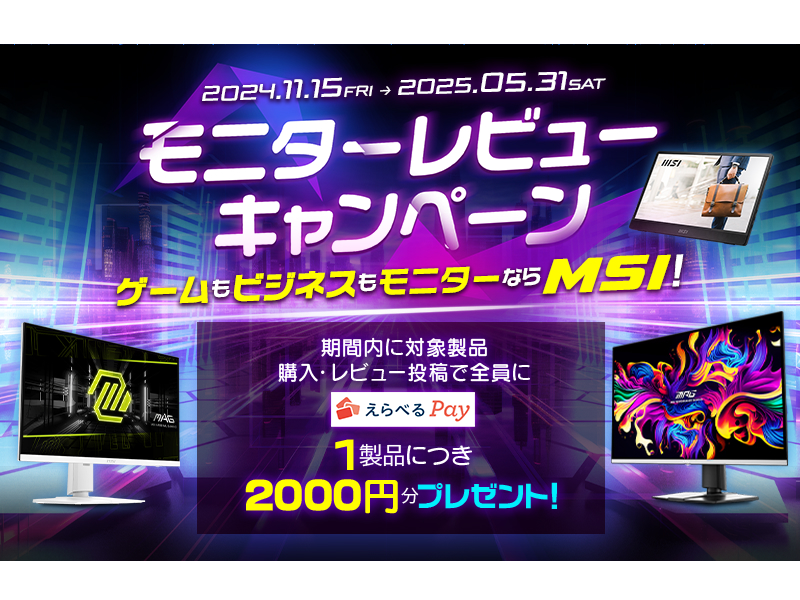 MSI、えらべるPayが必ずもらえる「モニターレビューキャンペーン」開催