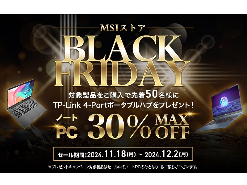 対象のノートPCが最大30%OFFになる「MSIストア BLACK FRIDAY」開催中