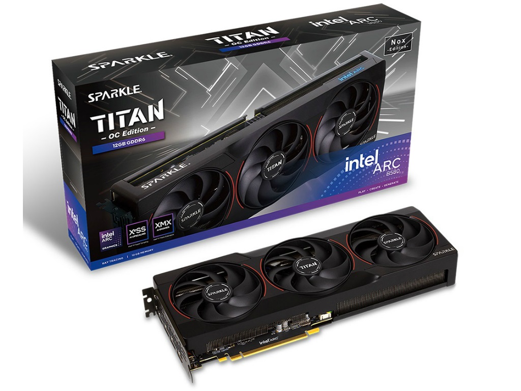 ブラックカラーの3連ファンクーラーを搭載する「SPARKLE Intel Arc B580 TITAN Nox OC」発売