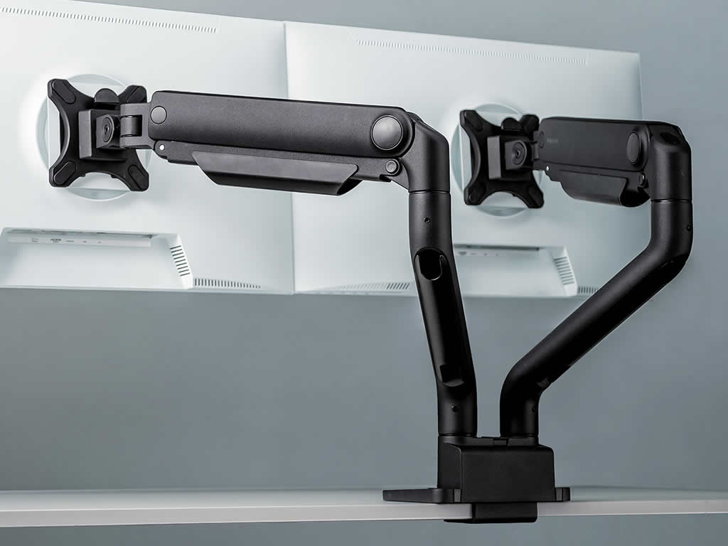 薄型クランプ採用のガススプリング式デュアルディスプレイアーム