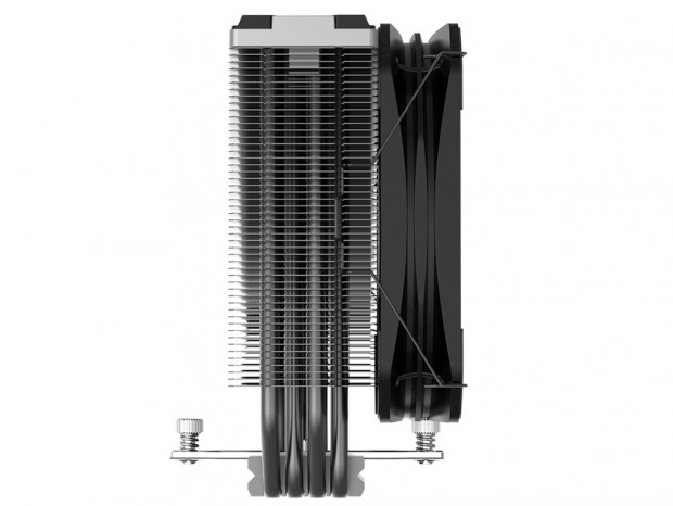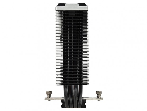 幅約48mmのヒートシンクを真横から眺めたところ。多くのサイドフロー型CPUクーラーがそうであるように、メモリスロットへの干渉を防ぐスリムタイプが採用されている