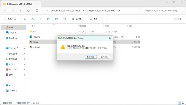 「BRIDGE CAST X」がPCに接続されていると、ドライバのインストーラーは起動しない。必ず接続する前にインストールを済ませておく