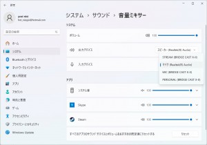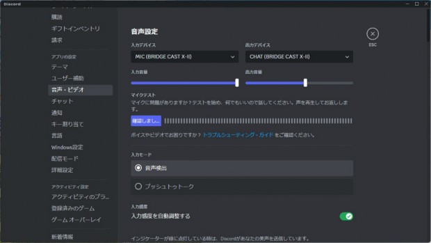 そこで、まずはWindows上の「音量ミキサー」の出力デバイスに「SYSTEM(BRIDGE CAST X-II)」を、入力デバイスに「MIC(BRIDGE CAST X-II)」を設定します。さらに「OBS Studio」のマイク音声に「STREAM(BRIDGE CAST X-II)」、「Discord」の入力デバイスに「MIC(BRIDGE CAST X-II)」、出力デバイスに「CHAT(BRIDGE CAST X-II)」をそれぞれ設定すれば、準備は完了です。