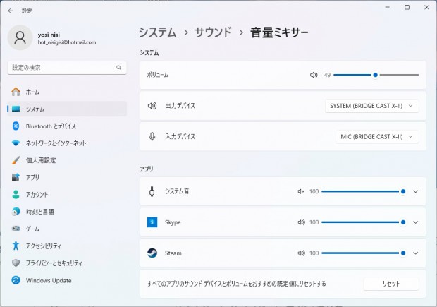 Windows上の「音量ミキサー」で、入力デバイスに「MIC(BRIDGE CAST X-II)」を設定すると、「BRIDGE CAST X」に接続したマイクから音声が入力可能。さらに出力デバイスに「SYSTEM(BRIDGE CAST X-II)」を設定すると、ヘッドホンを使って配信される音声のモニタリングができるようになる