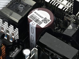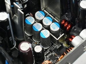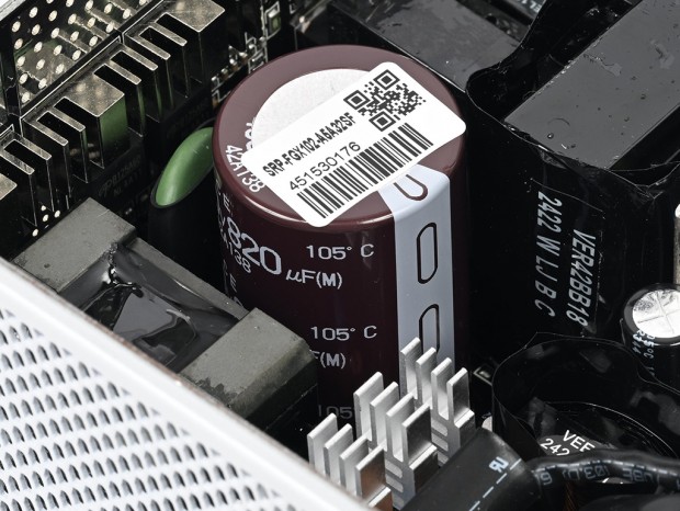 | 一次側の平滑回路に実装されている日本ケミコン製の105℃コンデンサ。耐圧420Vの大容量タイプがチョイスされている |
