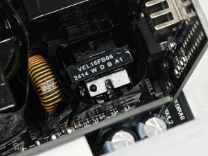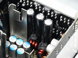 | 二次側の整流回路から平滑回路にかけてのエリア。応答性能に優れた固体コンデンサも実装されている | |