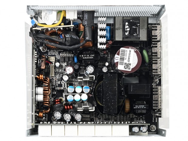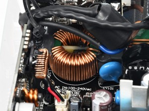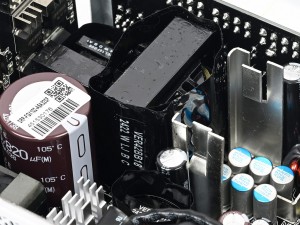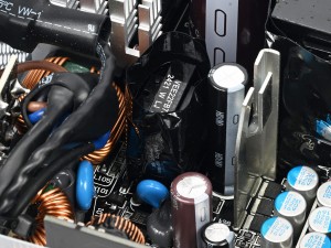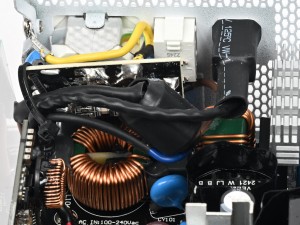 | サブトランスの向こう側に見えるヒートシンクには、一次側整流回路を構成するブリッジダイオードがマウントされている | 一次側整流回路から、力率を改善するアクティブPFC回路とそのコイル、一次側平滑回路にかけてのエリア |