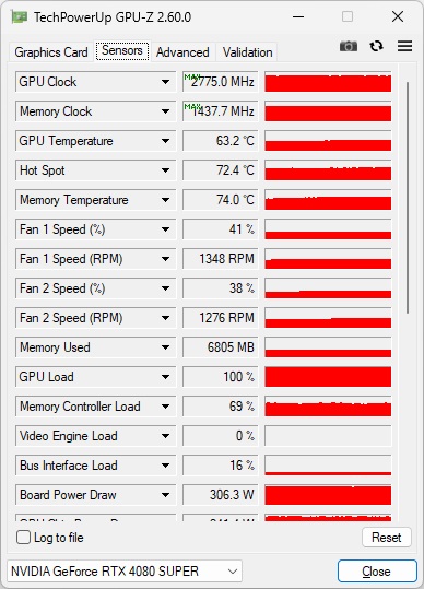| 「GeForce RTX 4080 SUPER Founders Edition」のスペック上におけるブーストクロックは2,550MHzだが、フルロード時は最大2,775MHzで動作していた | |